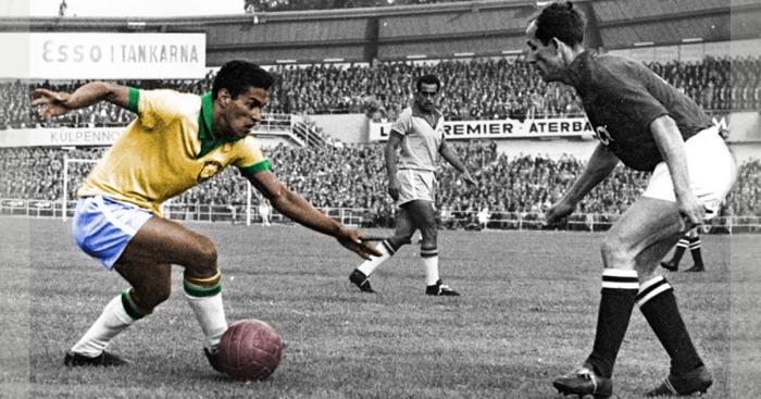 Do futebol ofensivo à era tática: como o jogo mudou ao longo dos anos Garrincha, da seleção brasileira, dribla um jogador da União Soviética, durante a Copa do Mundo de 1958 – Arte sobre foto FIFA